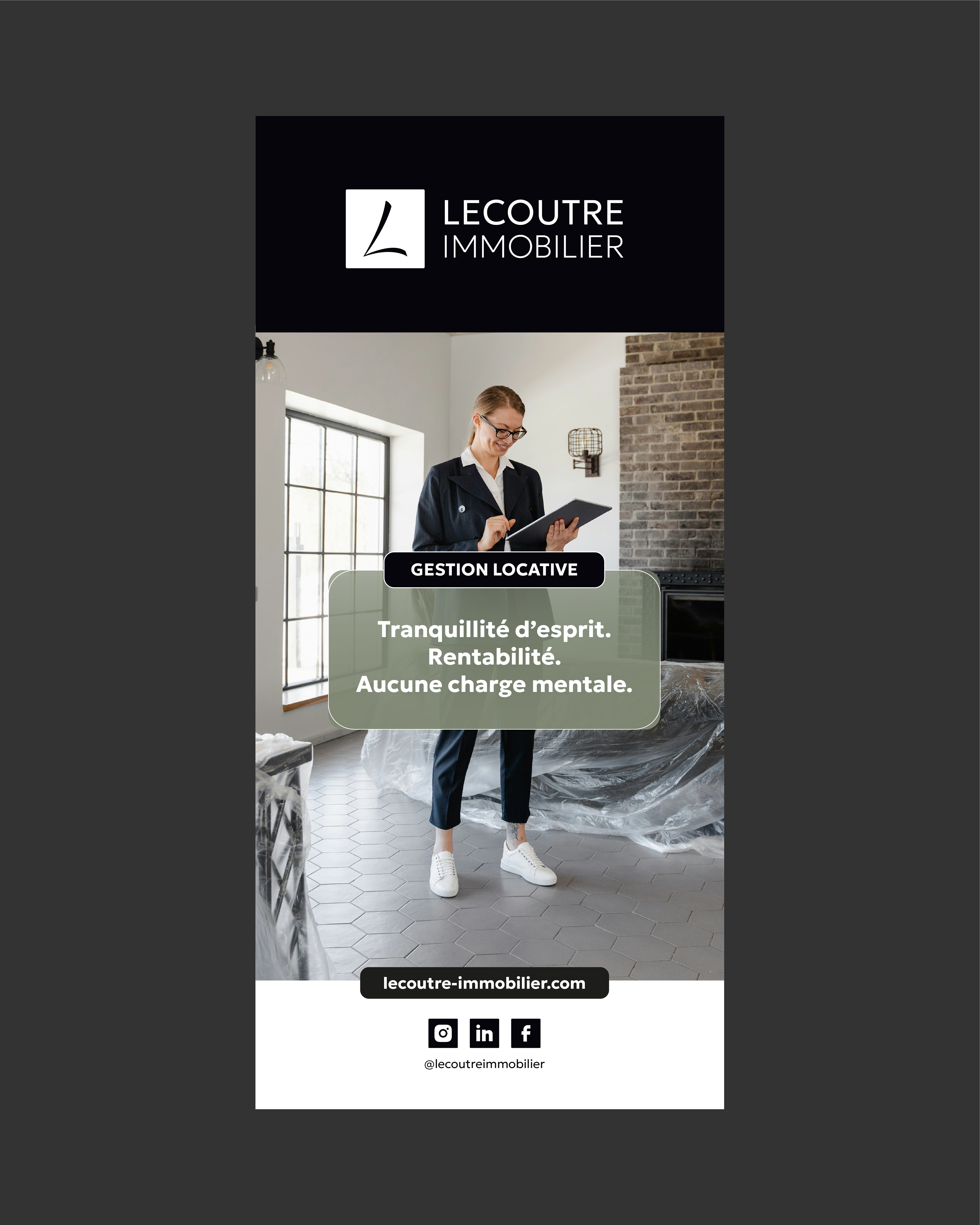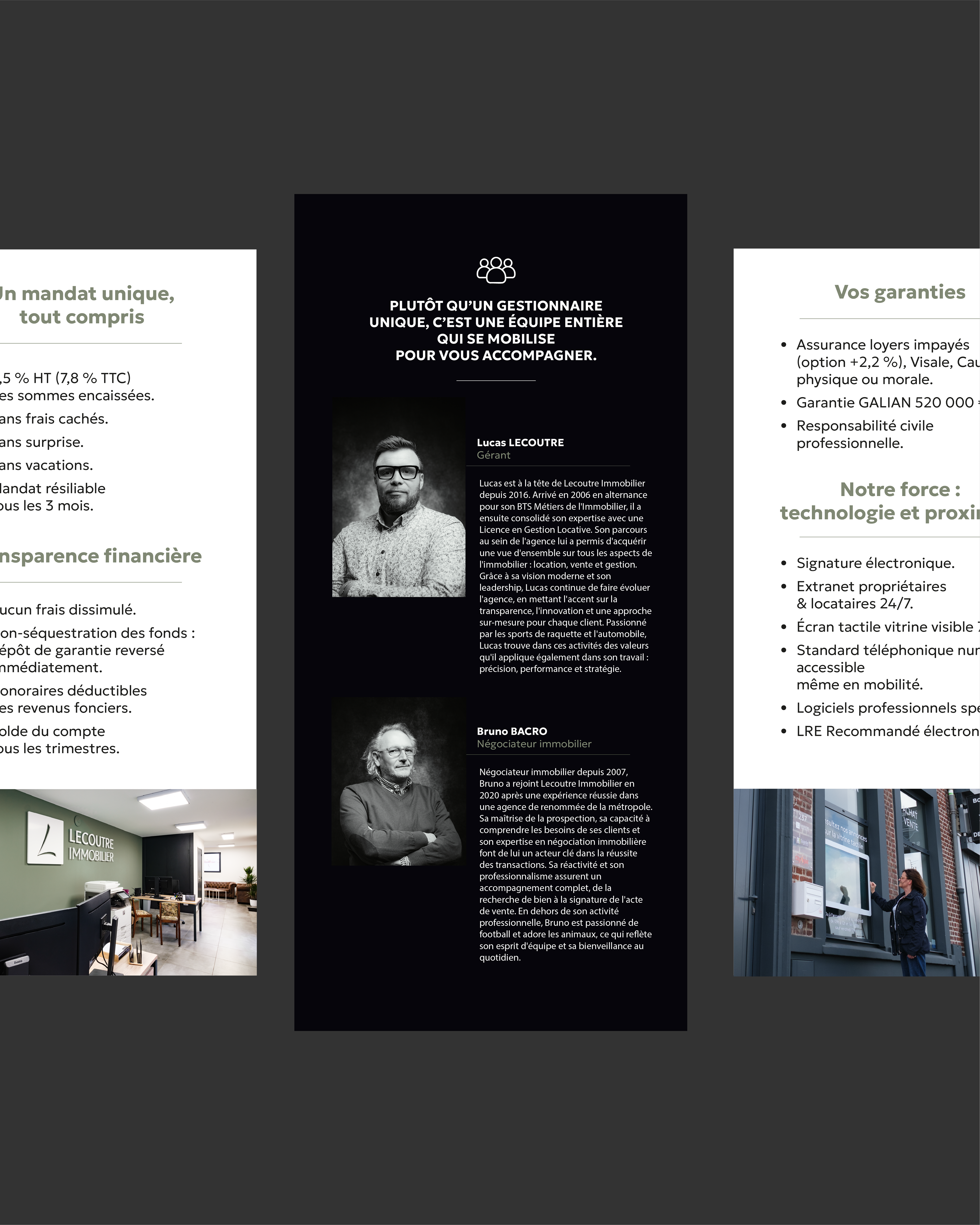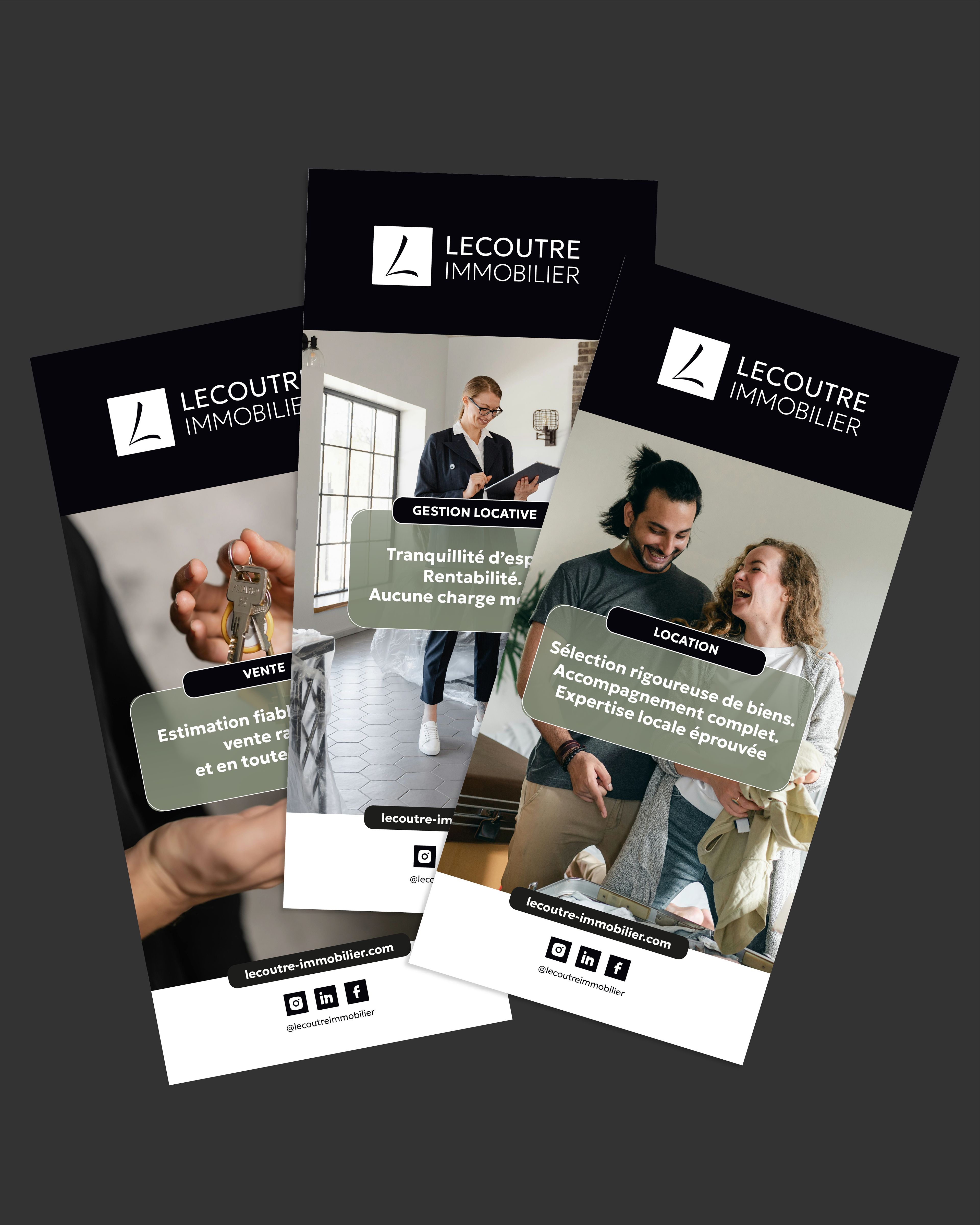 Une identité visuelle cohérente et soignée pour une agence immobilière Lecoutre Immobilier, agence implantée à La Madeleine (près de Lille), m’a confié la création et la déclinaison de plusieurs supports de communication print et digitaux. L’objectif : renforcer leur image de marque, harmoniser leur identité visuelle et développer une communication à la fois élégante, fluide et impactante. Pochette à rabats : Conception d’une pochette corporate permettant de glisser des documents à l’intérieur. Design soigné et mise en page fluide, en cohérence avec la charte graphique de l’agence. 👉 Un support élégant et pratique pour présenter des dossiers clients ou des offres immobilières. Cartes de visite : Création d’un modèle unique aligné sur l’identité graphique existante. Conseil pour l’impression : finitions premium (vernis sélectif, papier texturé, grammage épais). Une carte de visite haut de gamme, adaptée à la relation client. Stratégie digitale et réseaux sociaux : Création de visuels pour LinkedIn, Facebook et Instagram : bannières, images de profil, posts. Conseils en stratégie digitale pour renforcer la visibilité de l’agence en ligne et attirer de nouveaux prospects. Une communication digitale cohérente, moderne et professionnelle. Panneaux Akylux : Conception de 2 modèles de panneaux immobiliers : version À LOUER, version À VENDRE, Supports visuels clairs et impactants, parfaitement adaptés au terrain. Dépliant triptyque (format A4 plié 3 volets) : Présentation de l’agence, des services et des engagements. Mise en valeur des témoignages clients. Design soigné et mise en page fluide pour une lecture claire et agréable. Un support institutionnel qui valorise l’image de l’agence. Fiches A5 ou A4 recto-verso Création de 3 fiches distinctes, par métier : Gestion locative, Location, Vente Des fiches pratiques et harmonisées, permettant de présenter efficacement chaque service de l’agence. Signature mail :Création d’une signature d’email professionnelle, exportée en JPEG. Un élément simple mais essentiel pour véhiculer une identité professionnelle homogène dans tous les échanges. En résumé : L’ensemble des réalisations graphiques pour Lecoutre Immobilier reflète une identité visuelle cohérente et élégante, adaptée à la fois aux supports print (pochette, cartes de visite, dépliants, panneaux, fiches) et aux supports digitaux (réseaux sociaux, signature mail). Cette approche globale permet à l’agence : de renforcer son image de professionnalisme et de fiabilité, d’harmoniser ses supports de communication, et d’asseoir sa présence à la fois locale et digitale.