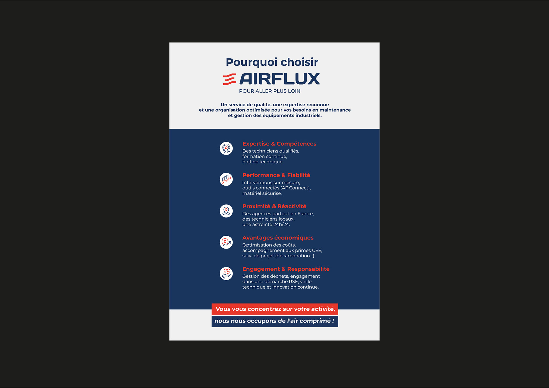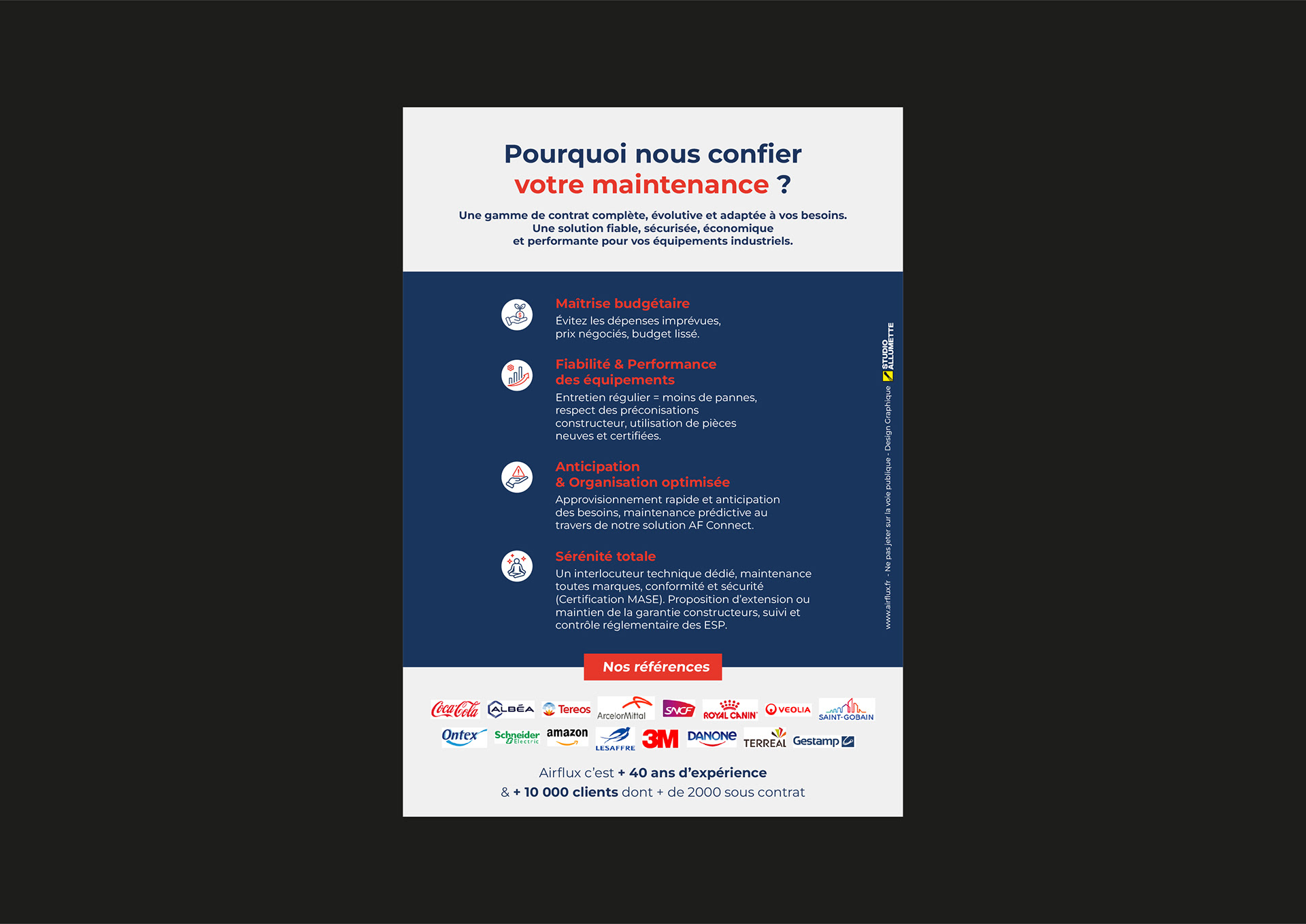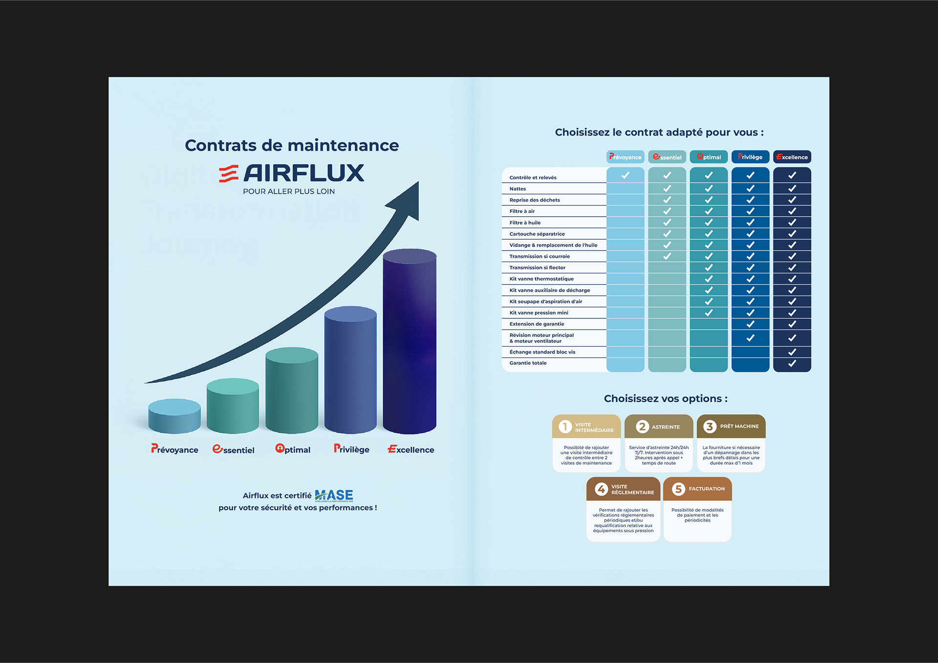 Réalisation d’un dépliant 4 pages pour AIRFLUX – Contrats de maintenance Pour la société AIRFLUX, spécialiste de l’air comprimé et de la maintenance industrielle, j’ai conçu un dépliant commercial 4 pages destiné à présenter leur offre de services et à valoriser leur expertise auprès des clients. L’objectif de ce support était double : Structurer clairement l’offre de maintenance à travers des contrats différenciés (Prévoyance, Essentiel, Optimal, Privilège, Excellence). Mettre en avant les atouts de l’entreprise : expertise technique, fiabilité, réactivité, avantages économiques et engagement RSE. Une mise en page claire et impactante : En tant que directrice artistique et graphiste freelance, j’ai repensé l’architecture éditoriale pour optimiser la lisibilité et l’impact visuel : Page de couverture : accroche et identité de marque. Pages centrales : présentation visuelle des contrats sous forme de tableau comparatif et d’infographie 3D. Dernière page : focus sur les valeurs et la promesse de l’entreprise. Design professionnel & cohérence graphique Ce dépliant reflète l’image de sérieux et de performance d’AIRFLUX grâce à : Une hiérarchisation claire des informations pour faciliter la lecture. Des graphismes modernes (pictogrammes, schémas, courbes évolutives). Un univers visuel cohérent avec l’identité corporate de la marque. Un outil commercial efficace Ce dépliant est utilisé par les équipes commerciales d’AIRFLUX pour : Présenter rapidement les avantages de chaque formule de maintenance. Valoriser l’accompagnement et l’expertise de la société. Offrir un support crédible et professionnel lors des rendez-vous clients. Ce projet illustre mon savoir-faire en communication B2B et en design de supports imprimés destinés à promouvoir des offres techniques et complexes de façon claire, attractive et efficace.