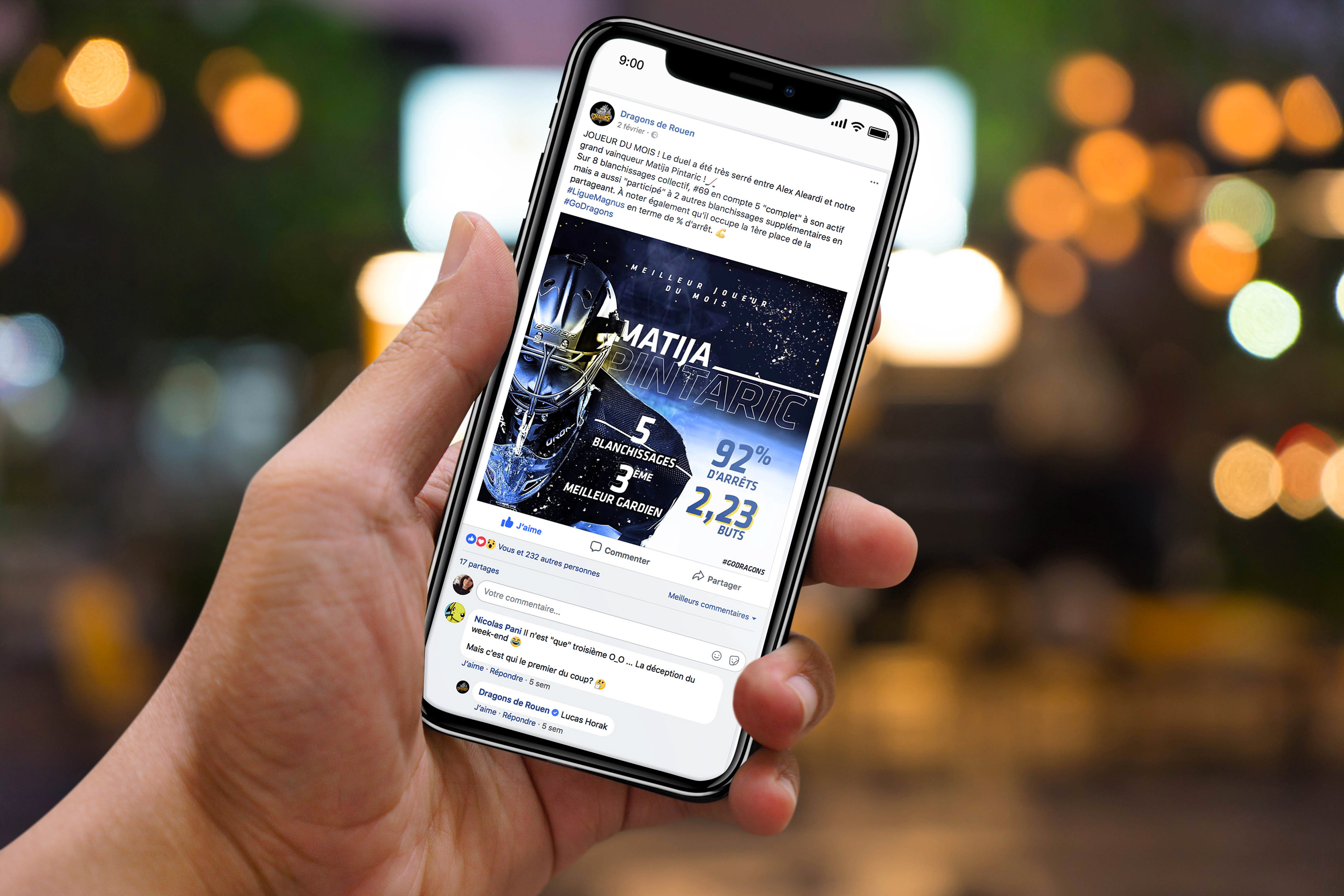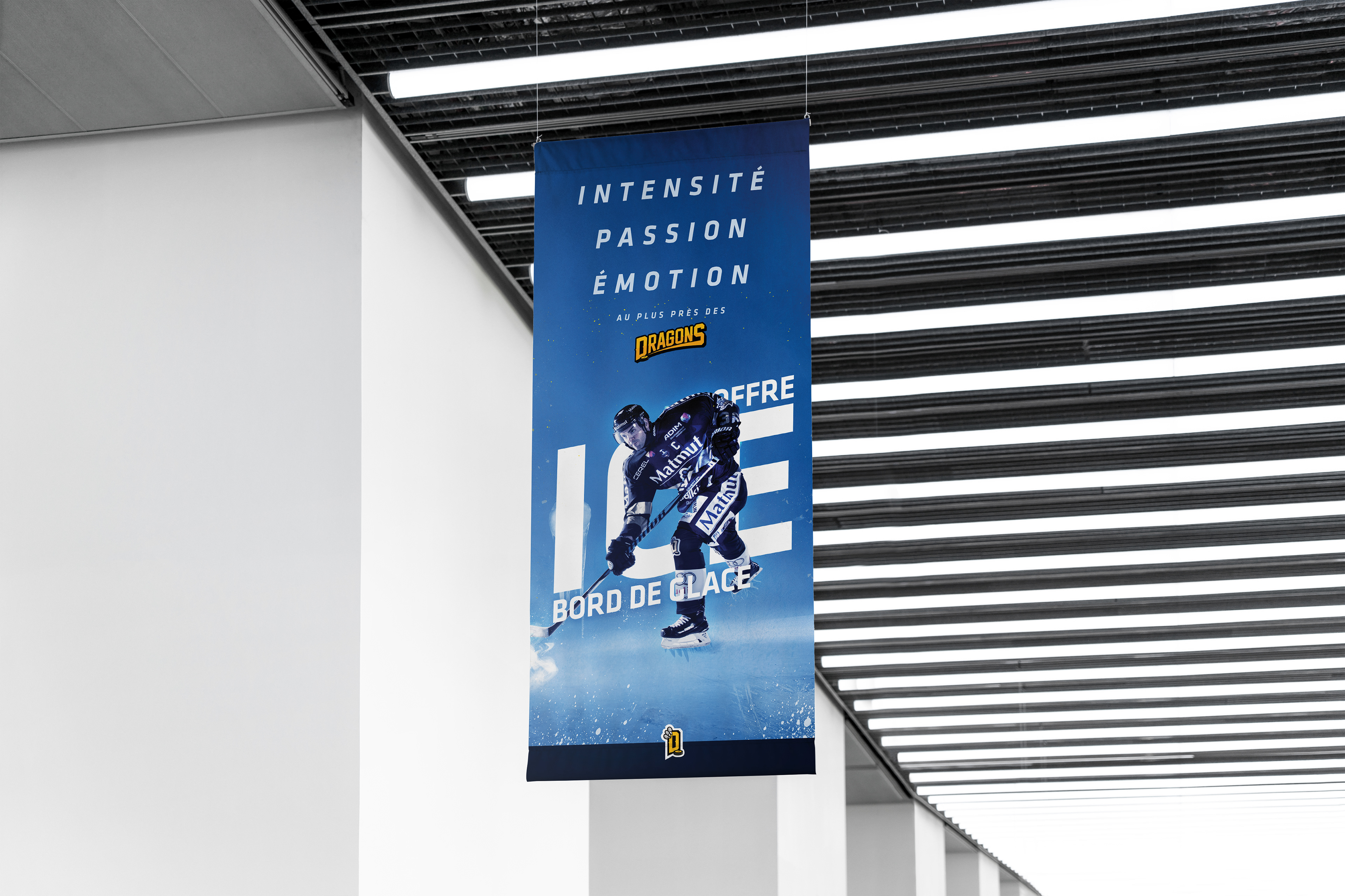 Une communication sportive et impactante Nous avons réalisé une série de visuels graphiques pour le RHE - Les Dragons de Rouen, club emblématique de hockey sur glace en France. L’objectif : concevoir des supports print et digitaux qui valorisent à la fois les performances des joueurs, l’identité du club et ses partenaires. Un visuel réseaux sociaux pour mettre en avant les performances des joueurs Nous avons créé un visuel digital destiné aux réseaux sociaux pour célébrer Matija Pintaric, élu meilleur joueur du mois. La mise en page met en avant ses statistiques sportives, avec un design moderne, dynamique et en cohérence avec l’univers visuel du club. Un support pensé pour capter l’attention en ligne et engager la communauté des supporters. Un totem événementiel pour valoriser les Dragons de Rouen En complément, un visuel totem grand format a été conçu pour mettre en avant le RHE - Les Dragons de Rouen dans les espaces physiques. Un design fort, utilisant les codes graphiques du club, qui renforce la visibilité de l’équipe et son identité auprès du grand public. Un visuel produit pour la marque Oroks by Decathlon Nous avons également réalisé un visuel dédié à la marque Oroks (Decathlon), partenaire du RHE, pour mettre en avant une crosse de hockey. Ce support associe l’image de marque d’Oroks à l’univers compétitif du club, créant une communication cohérente et percutante, à la croisée du sport et du produit. Résultat : une communication cohérente et puissante Grâce à ces créations, le RHE - Les Dragons de Rouen et ses partenaires bénéficient de : Visuels impactants pour les réseaux sociaux, Supports grand format pour une visibilité physique, Mise en avant d’un partenariat sportif avec Oroks by Decathlon. Visuels réseaux sociaux hockey sur glace. RHE Les Dragons de Rouen communication. Design totem sportif. Création graphique Oroks Decathlon. Identité visuelle club de hockey.