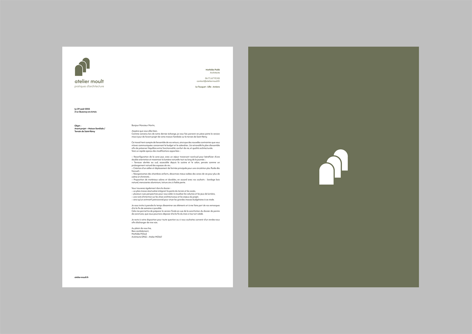 J’ai accompagné Mathilde Piollé, architecte récemment installée à son compte, dans la création de l’identité visuelle de Atelier MOULT. MOULT est un atelier d’architecture qui revendique une approche plurielle du métier, guidée par une volonté forte : s’adapter aux acteurs, aux territoires et aux imaginaires. Chaque projet est envisagé comme une expérience collective, ancrée dans une réalité sociale, territoriale et environnementale, où le dialogue et l’écoute occupent une place centrale. Une identité visuelle au service du sens et du collectif L’enjeu de cette identité visuelle était de traduire graphiquement la philosophie de l’atelier : une architecture sensible, contextuelle et profondément humaine. Le travail graphique repose sur un univers à la fois sobre, modulable et expressif, capable d’accompagner la diversité des projets menés par MOULT, qu’il s’agisse de collaborations avec des agences d’architecture, des collectivités, des porteurs de projet ou des particuliers. Les choix typographiques, les jeux de compositions et la palette chromatique ont été pensés pour refléter : la dimension collective du processus architectural, l’ancrage territorial des projets, et la souplesse nécessaire à une pratique plurielle. Studio Allumette, graphiste pour architectes et créateurs engagés Chez Studio Allumette, j’accompagne les architectes, studios et structures créatives dans la création d’identités visuelles sur mesure, cohérentes avec leurs valeurs, leur démarche et leur manière de concevoir le monde. Chaque projet est pensé comme une collaboration étroite, où le graphisme devient un outil de narration, de positionnement et de différenciation. Vous êtes architecte ou porteur·se de projet et souhaitez une identité visuelle qui fait sens ? Échangeons autour de votre univers et de vos intentions.