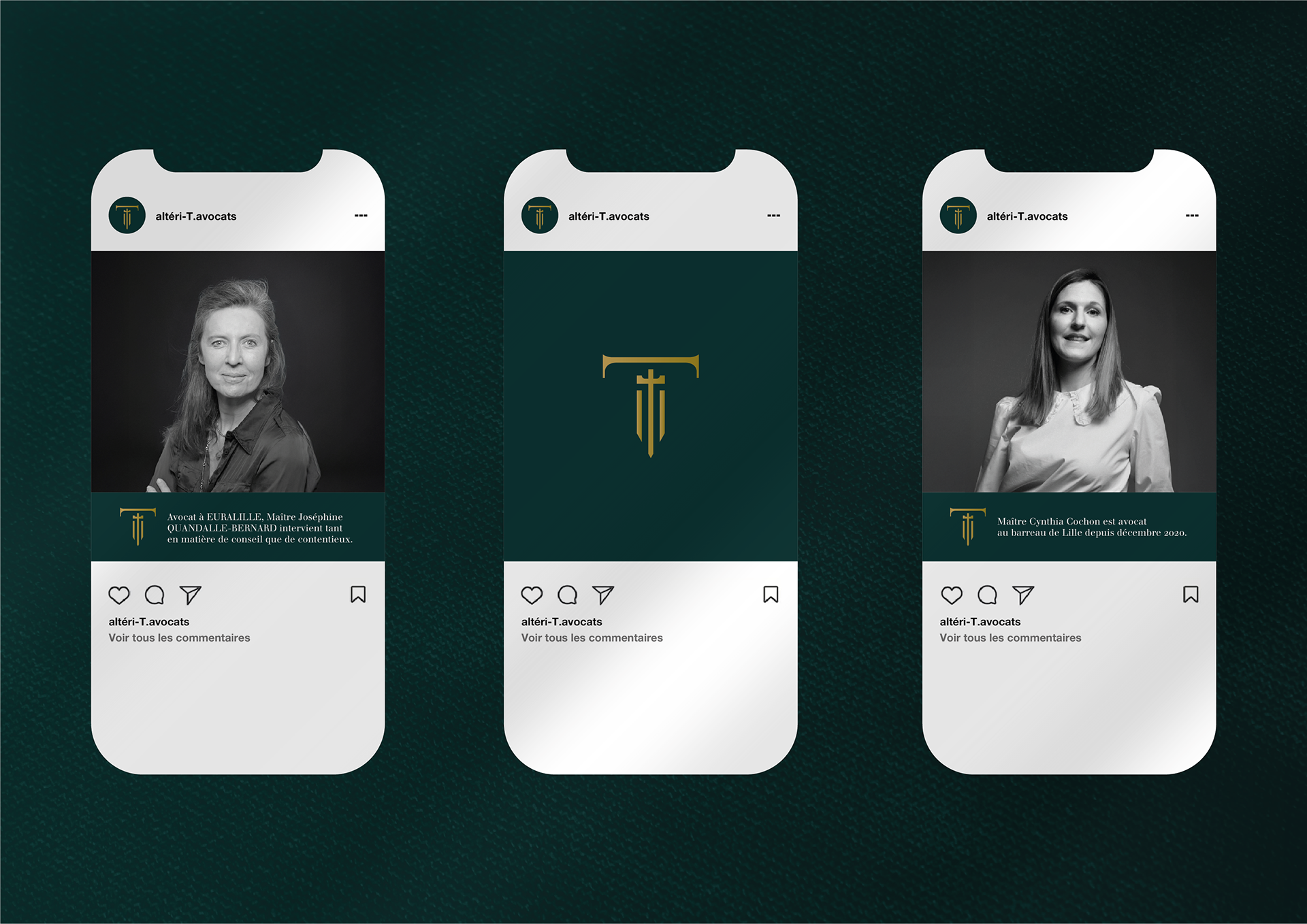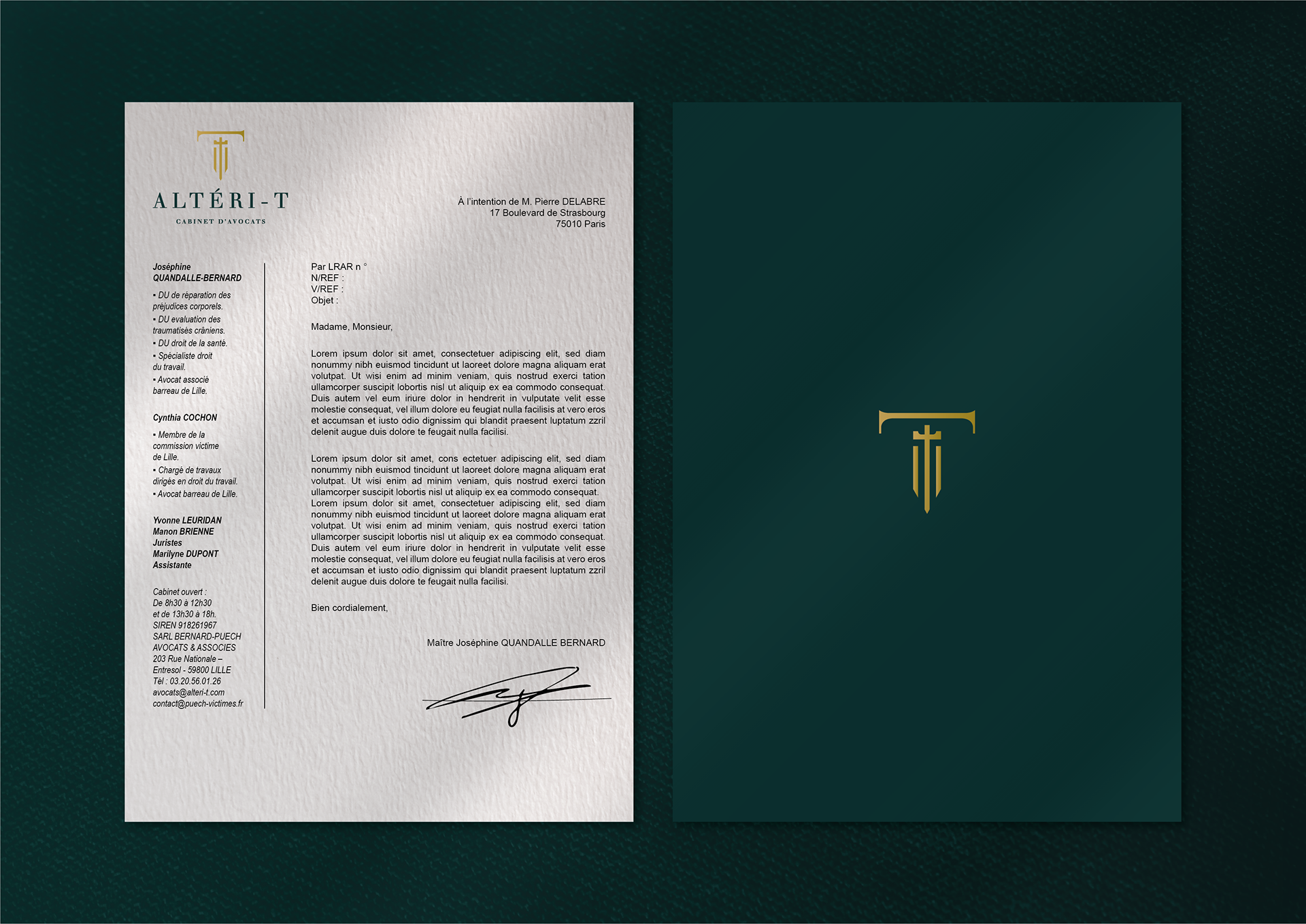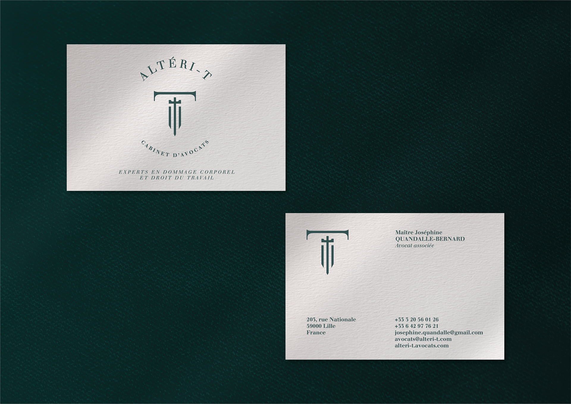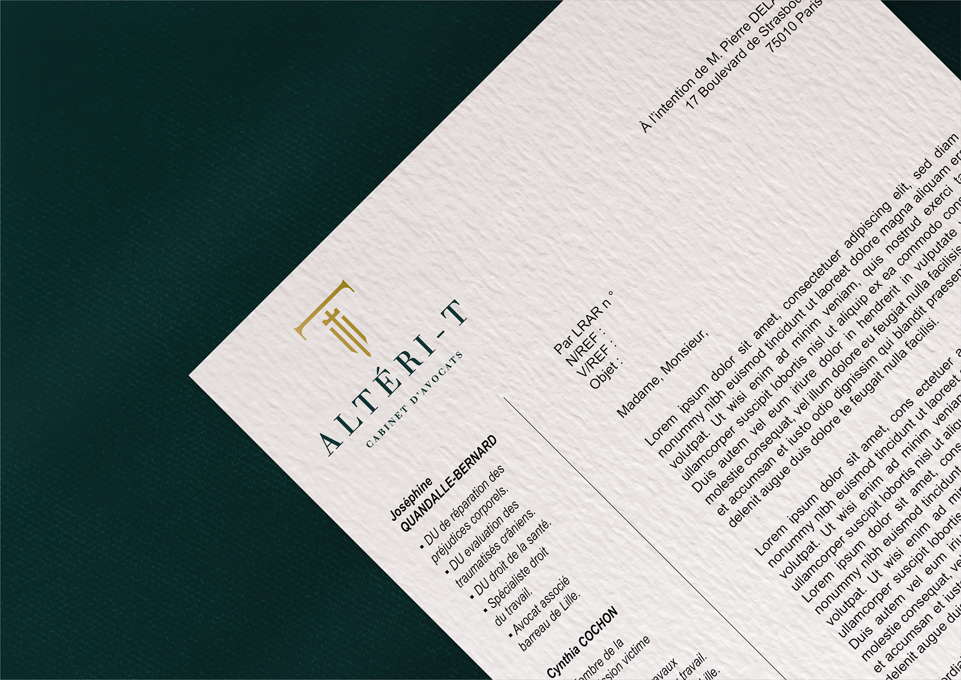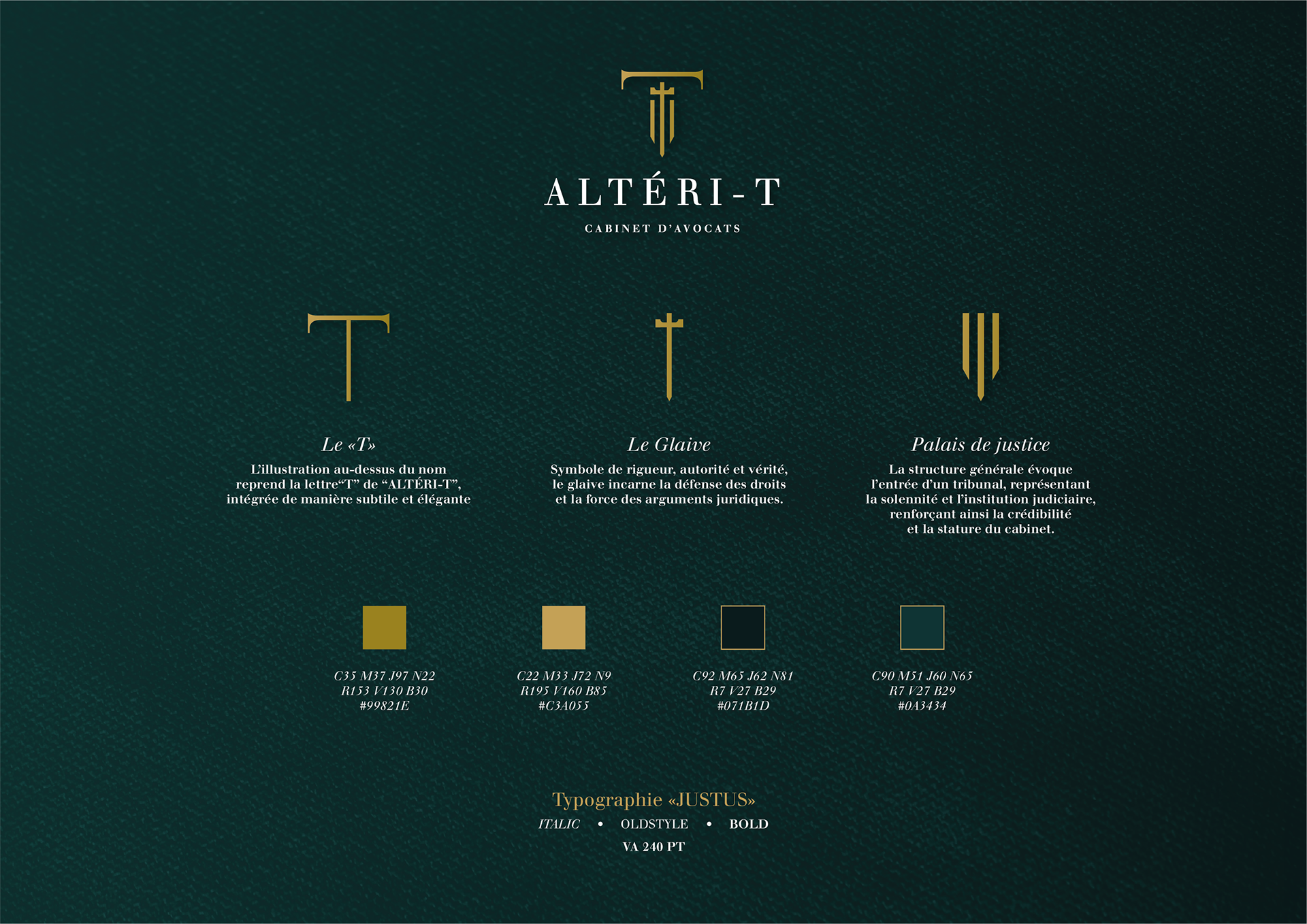 Création d’identité visuelle pour le cabinet d’avocats ALTÉRI-T — Studio Allumette Une identité visuelle forte et symbolique Chez Studio Allumette, nous avons conçu l’identité visuelle du cabinet d’avocats ALTÉRI-T, un projet où rigueur, élégance et symbolique juridique se rencontrent. L’objectif : traduire visuellement la crédibilité et la stature du cabinet grâce à un logo sur-mesure et une charte graphique cohérente. Un logo porteur de sens Le logo associe trois symboles puissants : Le « T » : intégré subtilement au monogramme, il fait écho au nom ALTÉRI-T et apporte une touche d’élégance graphique. Le Glaive : incarnation de la rigueur, de l’autorité et de la vérité, il symbolise la défense des droits et la force des arguments juridiques. Le Palais de justice : la structure générale évoque l’entrée d’un tribunal, image de solennité et d’institution judiciaire, renforçant la crédibilité et le prestige du cabinet. Une charte graphique élégante et intemporelle L’identité visuelle repose sur une palette de couleurs sobres et distinguées : Or profond (#9B8121 / #CA9D55) pour incarner la noblesse et l’excellence. Vert foncé (#071B1D / #043434) pour évoquer la stabilité, la confiance et la rigueur juridique. La typographie, avec ses déclinaisons en italic, oldstyle et bold, apporte une dimension classique et solennelle, parfaitement adaptée à l’univers du droit. Un branding adapté aux valeurs du cabinet. Cette identité visuelle confère à ALTÉRI-T une image professionnelle forte et distinctive, en phase avec ses valeurs : Défense des droits. Crédibilité et autorité. Rigueur et vérité. Le design conçu par Studio Allumette reflète l’équilibre entre tradition et modernité, garantissant une communication visuelle claire, mémorable et prestigieuse. Identité visuelle cabinet d’avocats Logo avocat. Charte graphique juridique. Design branding cabinet de droit. Studio de création identité visuelle.