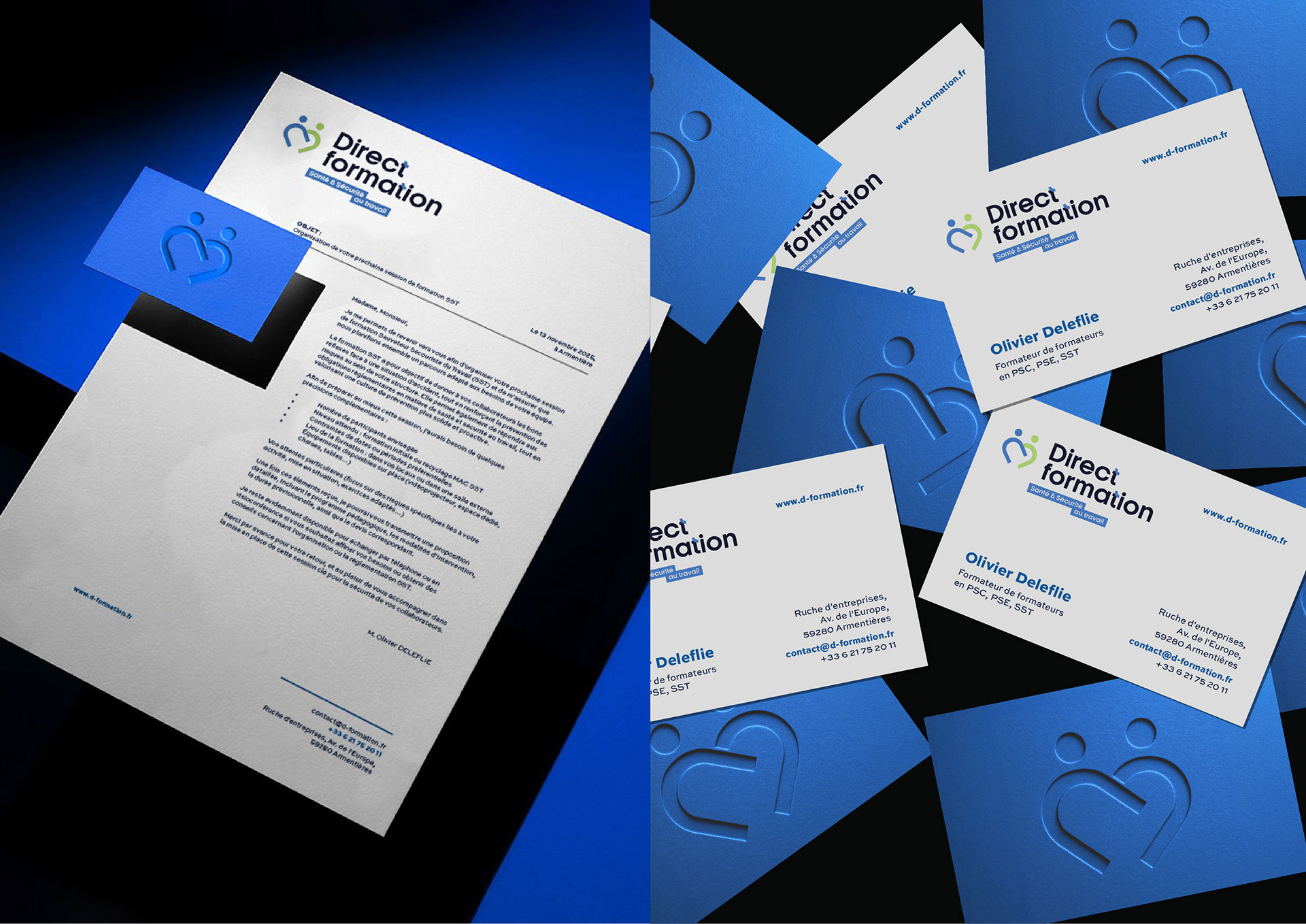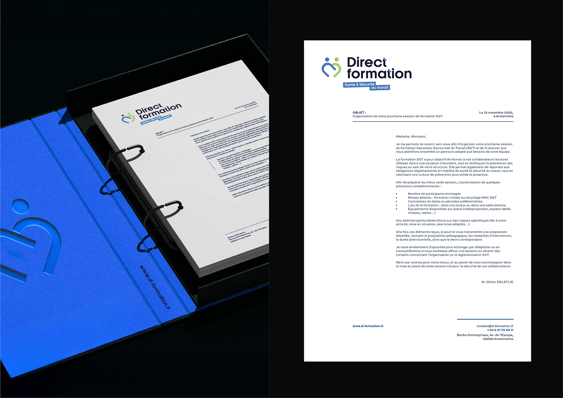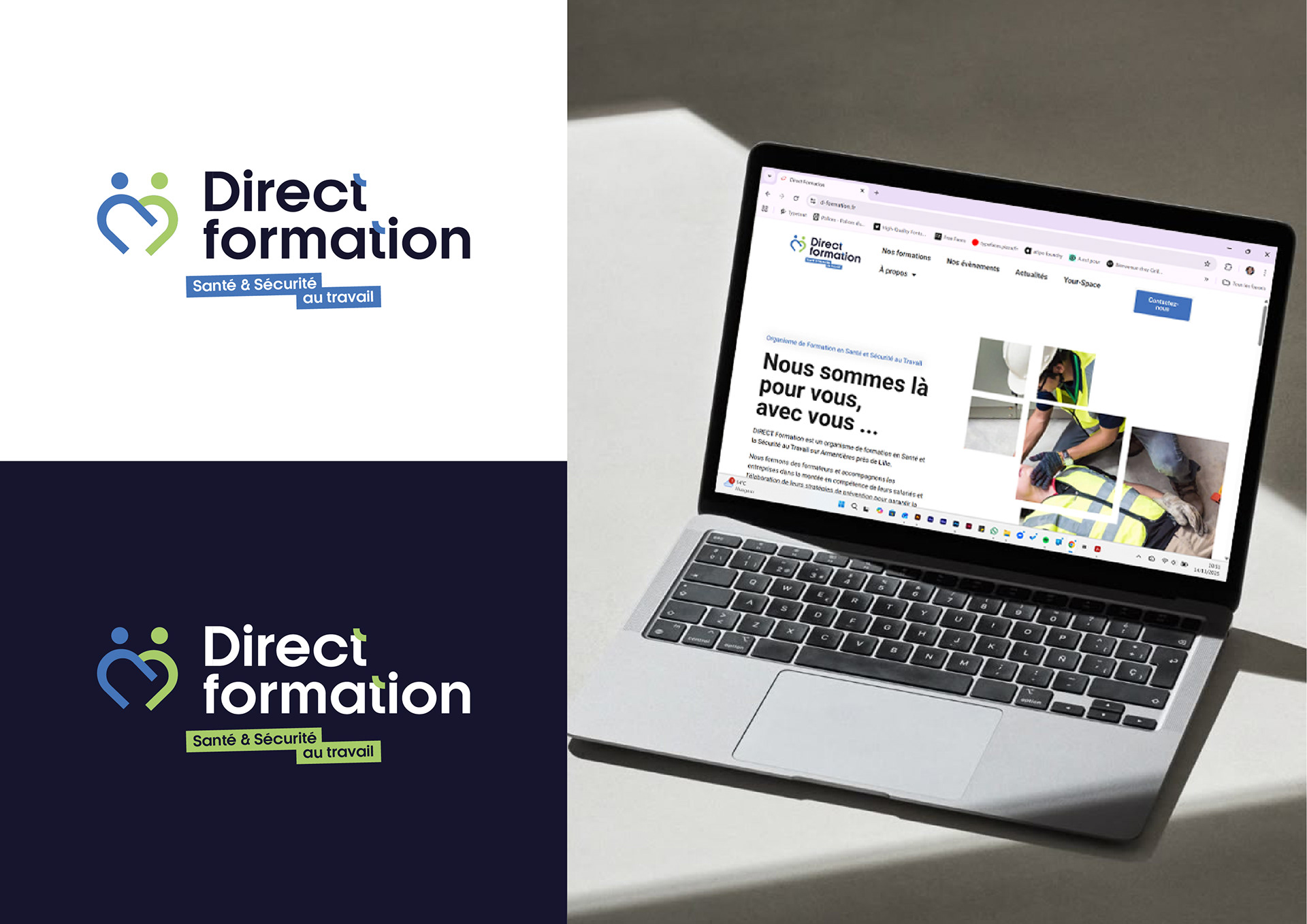 Studio Allumette, studio de création graphique spécialisé dans la création d’identités visuelles professionnelles, a accompagné Olivier Deleflie, directeur et formateur chez Direct Formation, dans la conception d’un univers visuel fort, humain et distinctif. L’enjeu : traduire graphiquement les valeurs fondamentales de l’organisme — santé, sérénité, accompagnement, pédagogie — tout en intégrant une touche légèrement décalée, fidèle à l’ADN de Direct Formation. Un logo centré sur l’humain et l’accompagnement Le symbole du logo représente deux personnes en interaction : le formateur et la personne formée. Leur geste évoque une démonstration de premiers secours, référence directe aux formations dispensées. Les silhouettes s’imbriquent pour former un cœur stylisé, symbole universel de la santé, de l’humain et de la bienveillance. Cette construction visuelle exprime la transmission, la proximité et la pédagogie, au cœur du métier de formateur. Une cohérence graphique issue du “D” de Direct Le symbole a été dessiné à partir de la forme du “D” de DIRECT, garantissant une cohérence formelle entre le logotype et l’icône. Ce choix renforce l’harmonie de l’identité visuelle, améliore la mémorisation du logo et affirme une image professionnelle claire et structurée pour un organisme de formation. Une palette de couleurs rassurante et professionnelle L’identité visuelle repose sur une association de couleurs porteuses de sens : Bleu, symbole de confiance, de sérieux et de crédibilité, très présent dans l’univers de la santé et de la formation. Vert, teinte douce évoquant la sérénité, la sécurité et l’apprentissage. Ce duo chromatique crée un équilibre rassurant et professionnel, parfaitement adapté à la formation en santé et sécurité au travail. Une typographie expressive et bienveillante Un détail typographique vient humaniser l’ensemble : un léger sourire intégré dans la barre des lettres “T” de “DIRECT FORMATION”. Ce clin d’œil graphique apporte de la douceur, de l’accessibilité et reflète une approche pédagogique basée sur l’écoute et la bienveillance. Une baseline dynamique et contemporaine Pour affirmer le côté plus vivant et décalé souhaité, la baseline “Santé & Sécurité au travail” est intégrée dans un encadré légèrement penché. Ce traitement graphique crée un effet dynamique, moderne et impactant, tout en évitant la redondance avec le mot “formation” déjà présent dans le nom. Cette identité visuelle pour organisme de formation reflète une structure engagée, humaine et professionnelle. Elle permet à Direct Formation d’affirmer un positionnement clair, rassurant et différenciant dans le domaine de la formation santé et sécurité, tout en valorisant l’accompagnement et la transmission au cœur de chaque intervention.