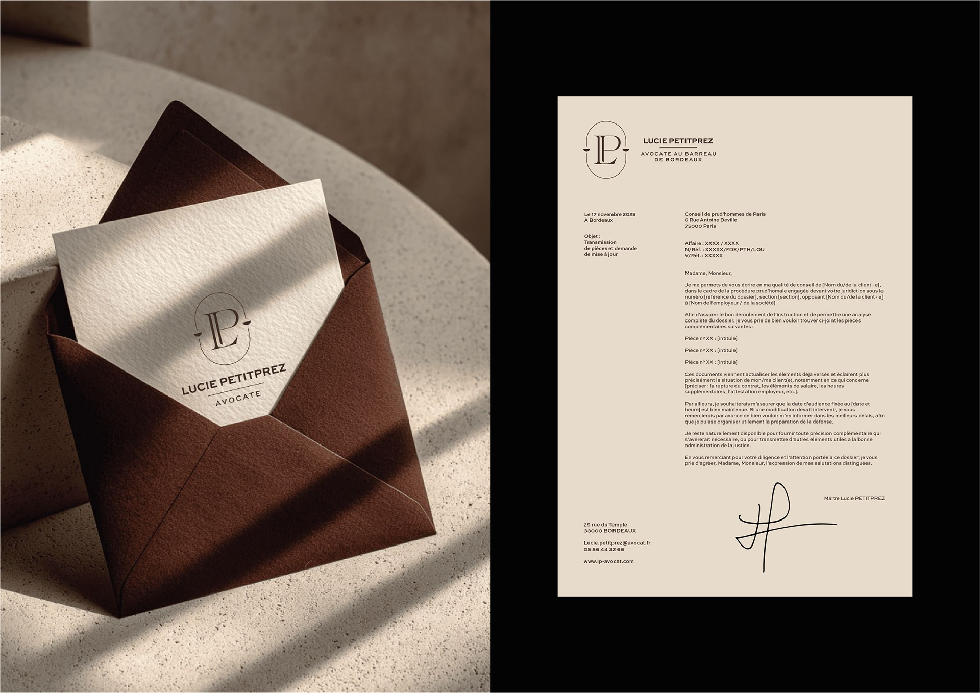 Pour accompagner Maître Lucie Petitprez dans la construction de son identité visuelle, j’ai imaginé un univers graphique singulier, élégant et profondément aligné avec les valeurs de sa profession. Mon objectif : créer une image de marque à la fois fiable, distinctive et intemporelle, capable de refléter son expertise juridique et la qualité de son accompagnement. Un monogramme LP pensé comme un symbole d’équilibre et d’autorité. Le cœur de l’identité repose sur un monogramme épuré regroupant les initiales L et P. Ce symbole s’inscrit dans un ovale aux lignes douces, évoquant immédiatement la notion d’accueil, d’écoute et d’humanité, essentielles dans la relation avocat-client. Les deux demi-cercles placés de part et d’autre du monogramme font référence aux plateaux de la balance, symbole universel de la justice. Les barres verticales formées par les lettres rappellent quant à elles les colonnes d’un palais de justice, ajoutant une touche d’institutionnel et de crédibilité. Cette double lecture – humaine et structurelle – permet de poser une identité subtile, forte et mémorable. Une palette de couleurs sobres et haut de gamme. J’ai opté pour une palette chaleureuse mêlant brun profond et beige lumineux, des teintes qui transmettent sérieux, neutralité et raffinement. Le brun (#3e2c24) apporte densité et autorité, tandis que le beige clair (#e8ddcc) crée un équilibre visuel moderne et doux, idéal pour une communication professionnelle élégante. Cette association de couleurs crée un univers cohérent, affirmé et immédiatement reconnaissable. Une typographie raffinée pour une communication claire. Afin de renforcer le positionnement haut-de-gamme de l’identité, j’ai sélectionné une typographie élégante et contemporaine : Sweet Sans Pro pour les titres et Adobe 명조 Std pour les textes d’accompagnement. Cette combinaison crée un dialogue entre modernité et tradition, parfaitement adapté au secteur juridique. Une identité cohérente déclinée sur l’ensemble des supports. L’identité visuelle de Lucie Petitprez a été pensée pour être forte et lisible sur l’ensemble de ses supports : - cartes de visite professionnelles, - papier à en-tête et documents juridiques, - correspondances officielles, - tampon de certification, - signatures mail, - enveloppes et supports imprimés. Chaque élément a été conçu pour renforcer la perception de confiance, de professionnalisme et de rigueur juridique, tout en valorisant le style et la singularité de Maître Petitprez. Une identité visuelle qui renforce la confiance. Cette identité graphique permet à Maître Lucie Petitprez de se distinguer dans un secteur exigeant, en reflétant : - son sens de l’équité, - la qualité de son accompagnement, - son écoute et sa disponibilité, - son professionnalisme. L’ensemble construit une marque personnelle forte, cohérente et durable, au service de son positionnement d’avocate moderne, humaine et engagée.