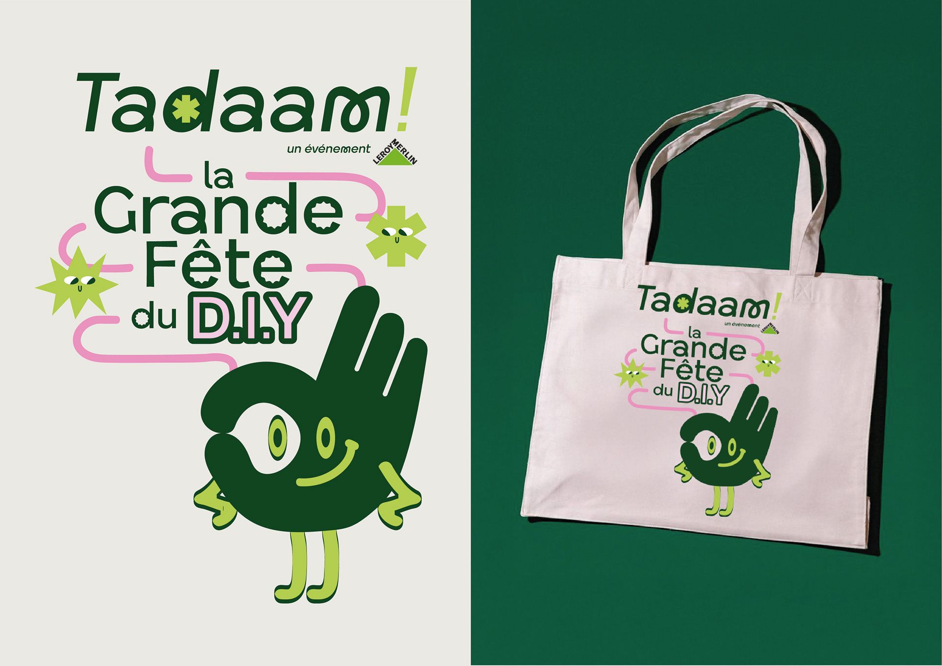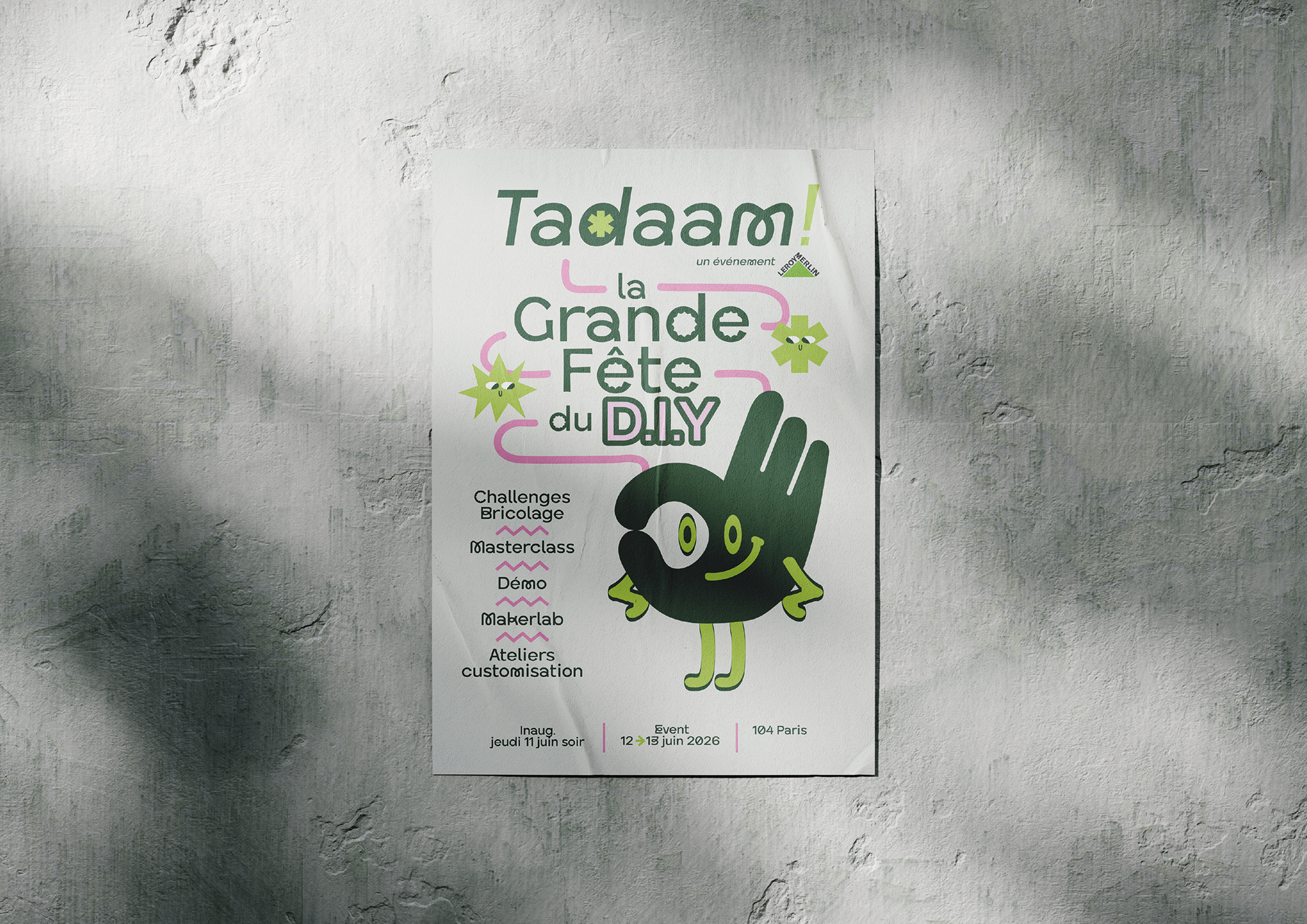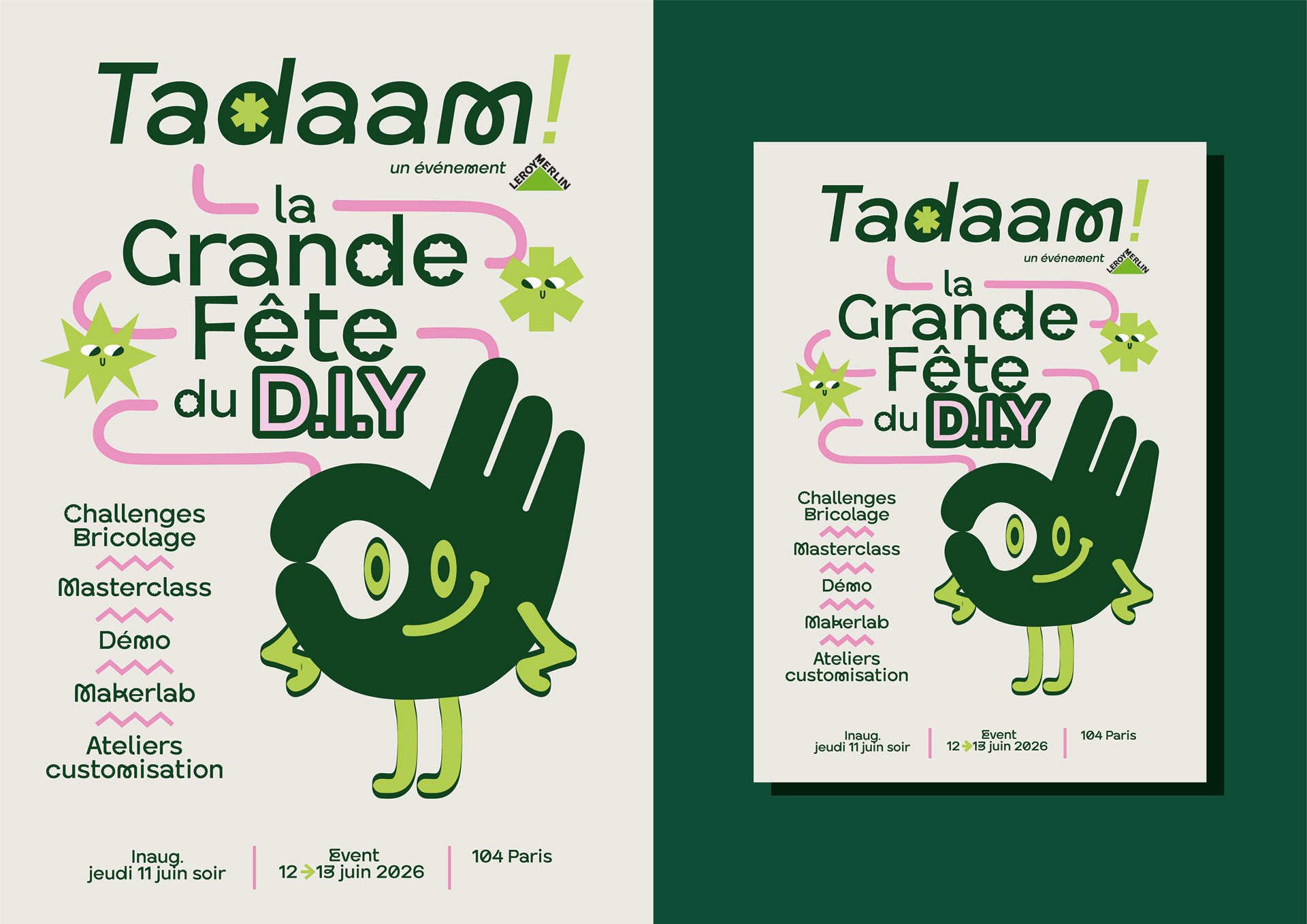 Cette affiche événementielle a été conçue pour incarner l’esprit créatif, festif et accessible du DIY (Do It Yourself). L’objectif était de traduire graphiquement le concept de « parc d’attraction du DIY » à travers un design coloré, pop et immédiatement reconnaissable. Une main comme symbole du DIY L’élément central de la composition est une main stylisée, qui incarne plusieurs dimensions : le geste manuel, cœur du bricolage et de la création DIY, la fierté du faire soi-même, la réussite, grâce au signe universel du « OK », clin d’œil direct au nom de l’événement TADAAM, synonyme de satisfaction et d’accomplissement. Une identité visuelle colorée et dynamique Dégradés pop : appliqués en ombre portée, ils renforcent l’aspect festif et joyeux du visuel. Ils suggèrent aussi des matériaux comme des planches de bois ou des structures à assembler, rappelant l’univers du bricolage et de Leroy Merlin. Typographie anguleuse et fragmentée : inspirée des plans de montage et des pochoirs industriels, elle traduit l’univers DIY de manière graphique et stylisée, tout en restant lisible. Texture grainée : ajoutée sur l’ensemble de l’affiche, elle apporte une touche contemporaine entre vintage et design actuel, en cohérence avec les tendances graphiques print et digitales. Une hiérarchie claire pour les informations pratiques Les informations de l’événement sont intégrées de manière structurée, garantissant une lecture fluide et une bonne hiérarchie visuelle. Le visuel garde ainsi toute sa force d’impact sans sacrifier la clarté. En résumé Cette création graphique traduit l’esprit de l’événement TADAAM : un univers DIY festif et accessible, une identité colorée, pop et impactante, un design qui associe créativité, ludisme et clarté. Une affiche événementielle sur mesure, qui attire l’œil, transmet l’énergie de l’événement et reflète parfaitement l’ADN du DIY.