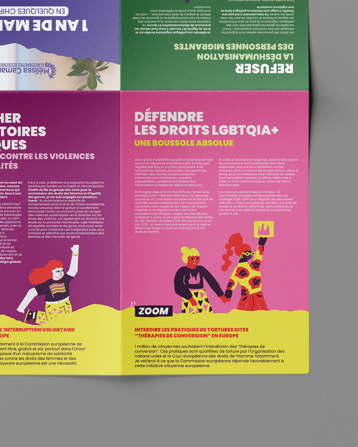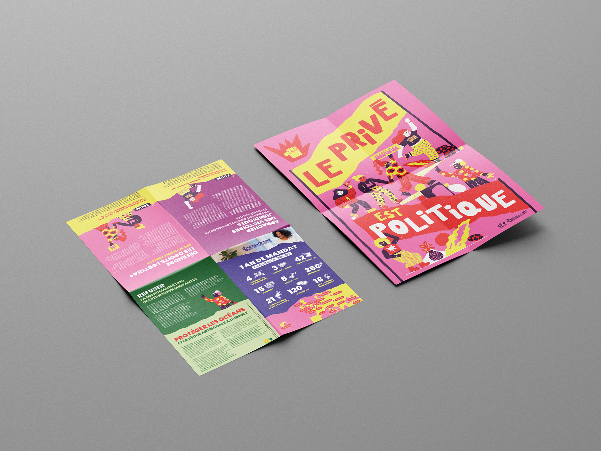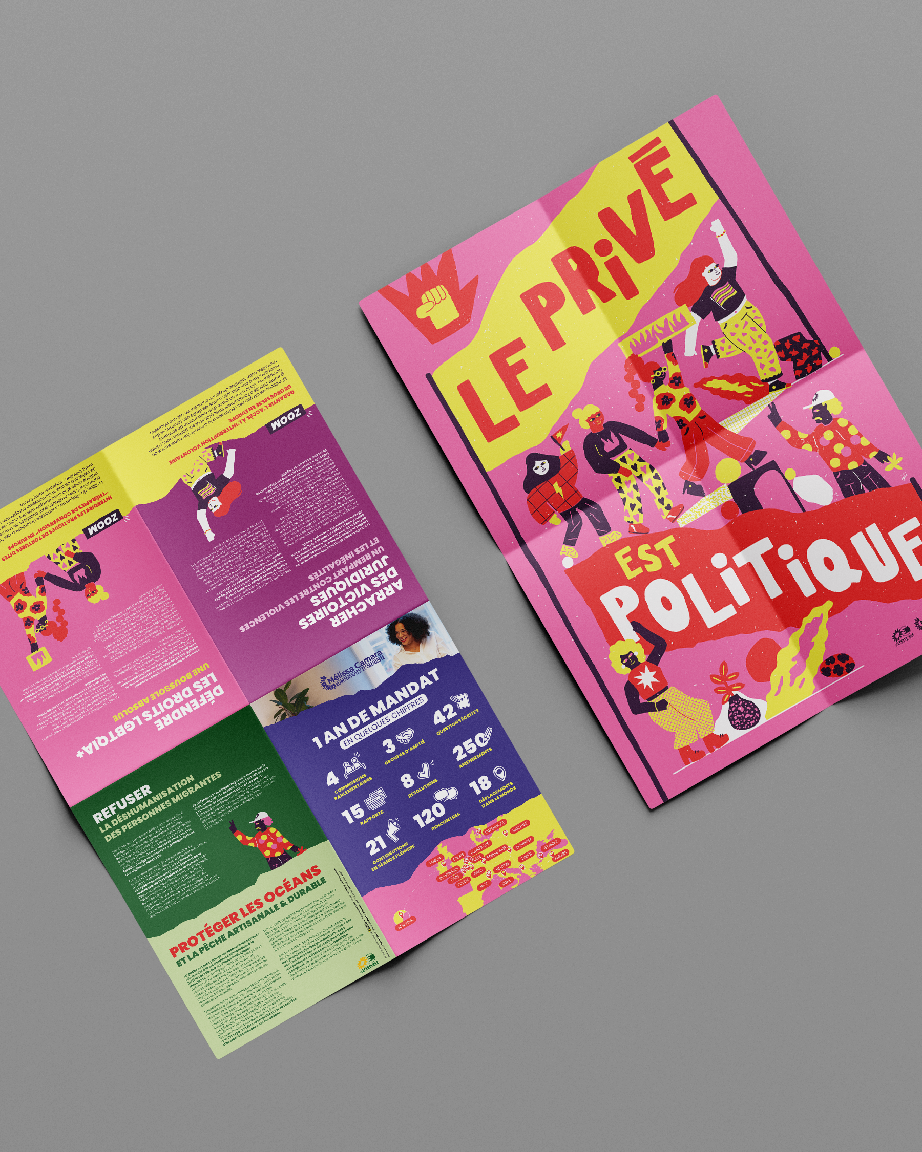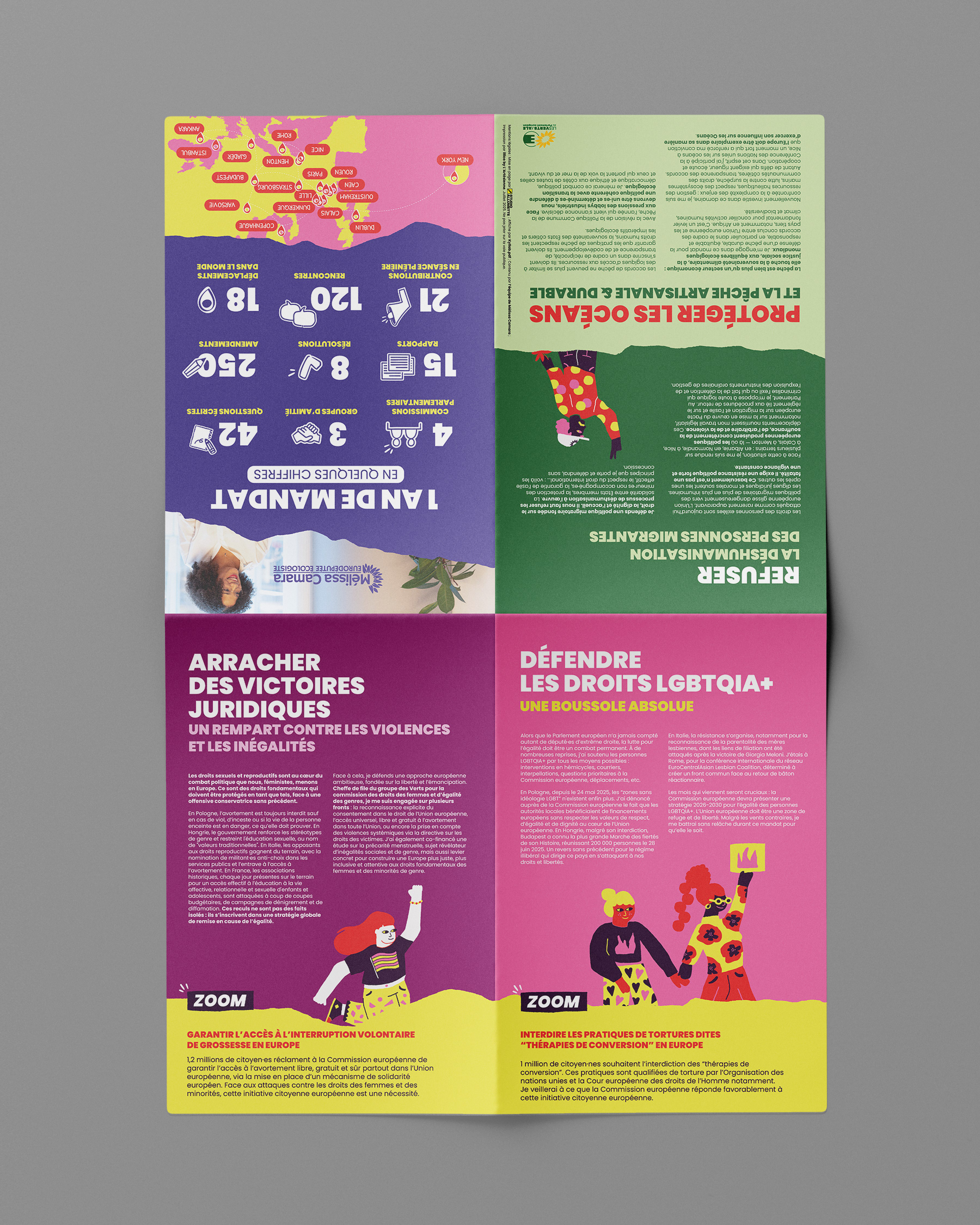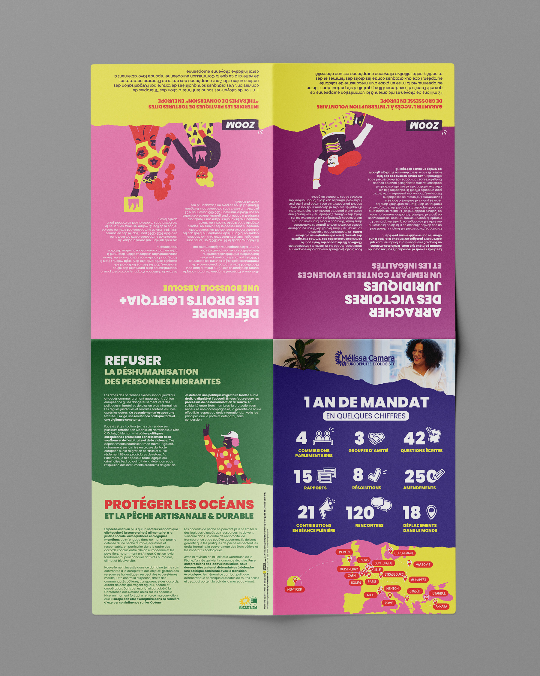 Pour le projet de communication de Mélissa Camara (Parlement européen), j’ai réalisé le verso d’une affiche 40x60 cm en respectant la charte graphique existante et en y apportant un design complémentaire et adapté. Un contenu structuré en 4 espaces Infographie statistique : mise en avant des chiffres clés du mandat (questions posées, interventions, actions parlementaires…). Textes thématiques : deux encarts de textes clairs et synthétiques autour des grands thèmes du mandat (droits des femmes, LGBT+, migrations). Carte de l’Europe : représentation visuelle des déplacements effectués. Éléments visuels intégrés : reprise de certains éléments graphiques issus du recto de l’affiche pour assurer une cohérence visuelle. Un travail complet de mise en page professionnelle Conception et hiérarchisation des contenus. Réflexion sur la lisibilité et l’impact graphique. Réalisation de la mise en page et préparation technique. Export PDF HD prêt à l’impression. Ce type de prestation démontre mon expertise en graphisme print, en mise en page complexe et en création d’infographies impactantes, adaptées aux besoins de communication institutionnelle, associative ou événementielle.